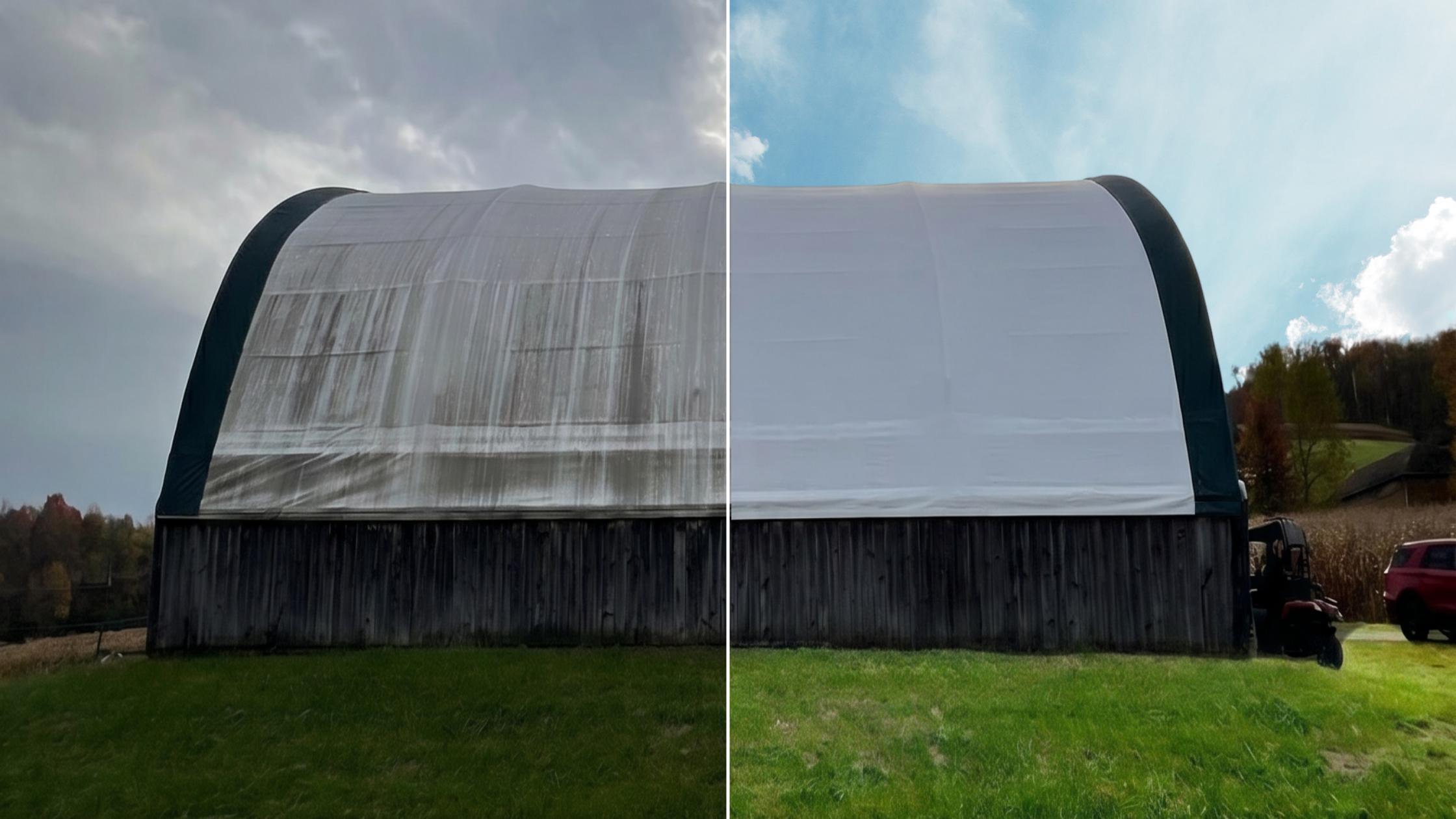 Split screen view of a Britespan fabric building. On the left, a building in need of cleaning and maintenance. On the right, a perfectly tensioned and clean building on a brighter day. Spring Fabric Building Maintenance: How to Protect Your Structure After Winter